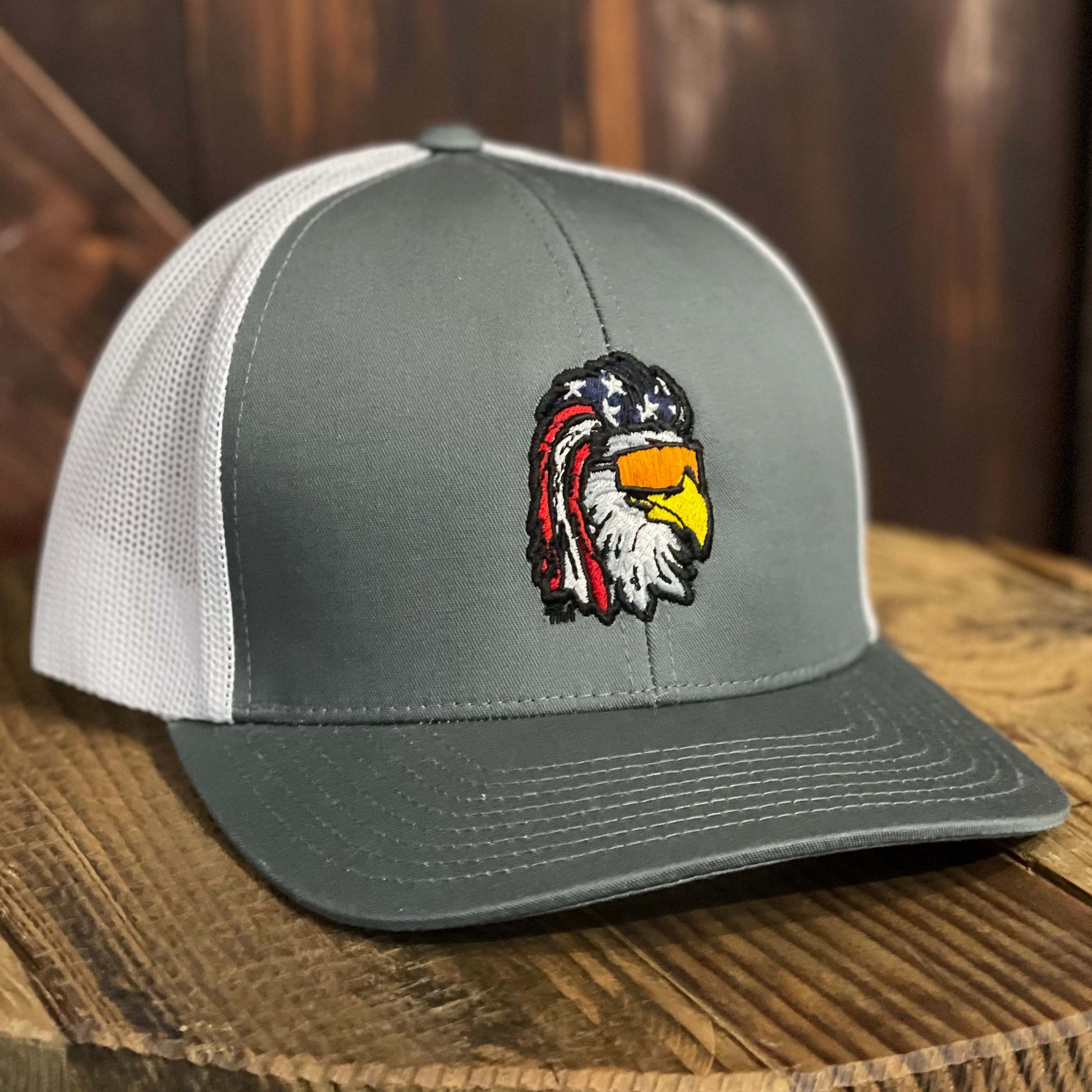 The Eagle Mullet hat. This is a charcoal and white hat embroidered with the Eagle Mullet logo in full color. The hat brand is Pacific Headwear. Variations in minor details may occur in the embroidery from hat to hat.
